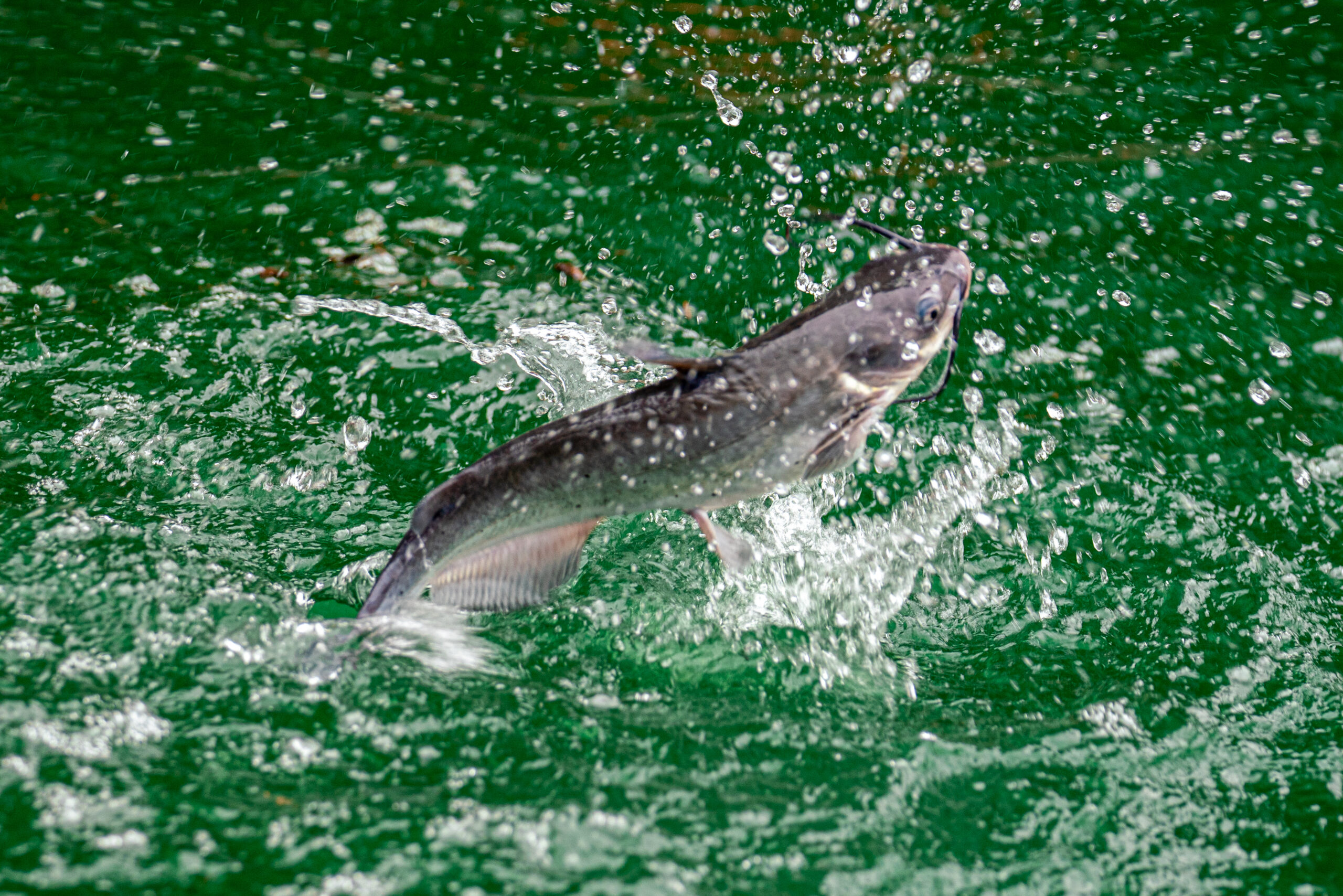 A catfish leaps out of the water while being reeled in by a fisher at Spring Valley Trout Farm in Dexter, Michigan on June 26, 2025. (Photo Credit: Donté Smith/Great Lakes Now)