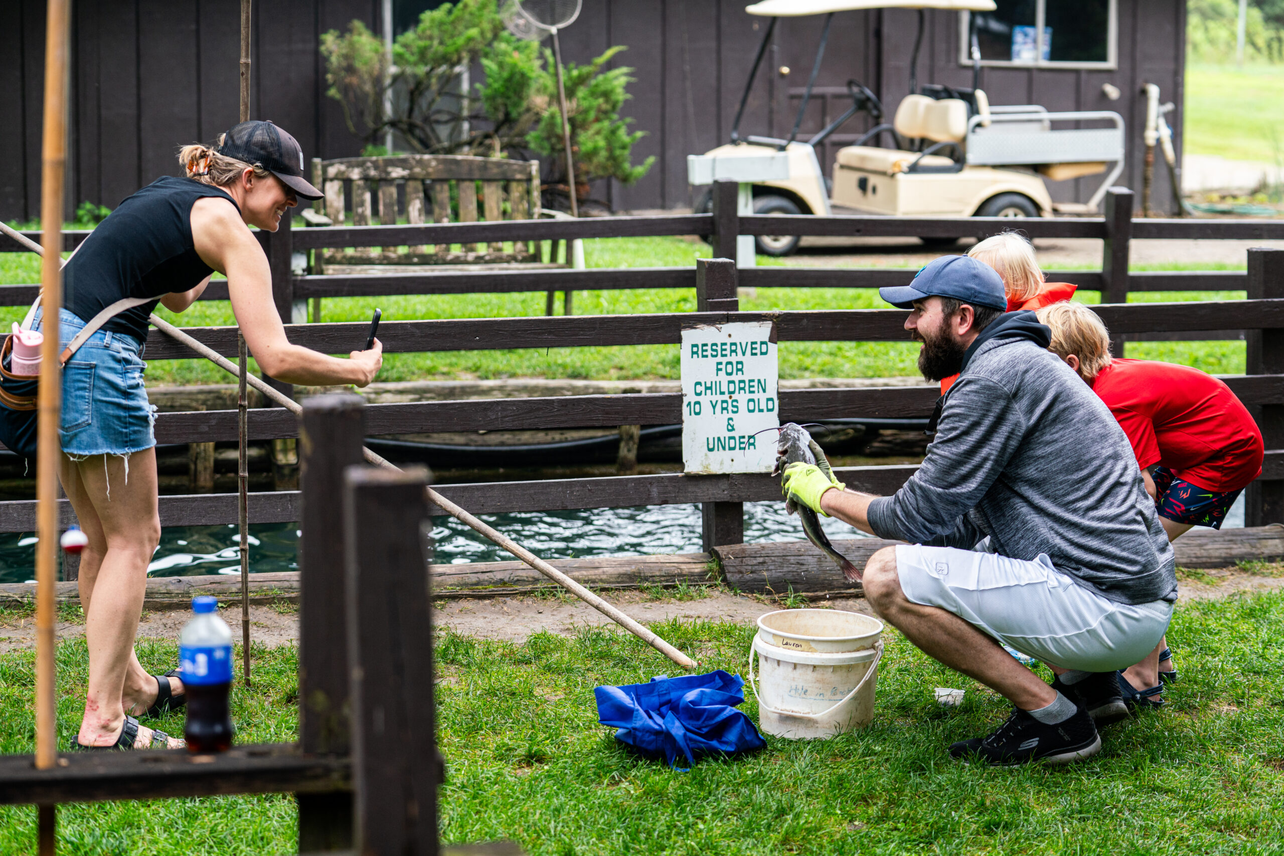 A family poses for a photo with their catch at Spring Valley Trout Farm in Dexter, Michigan on June 26, 2025. (Photo Credit: Donté Smith/Great Lakes Now)