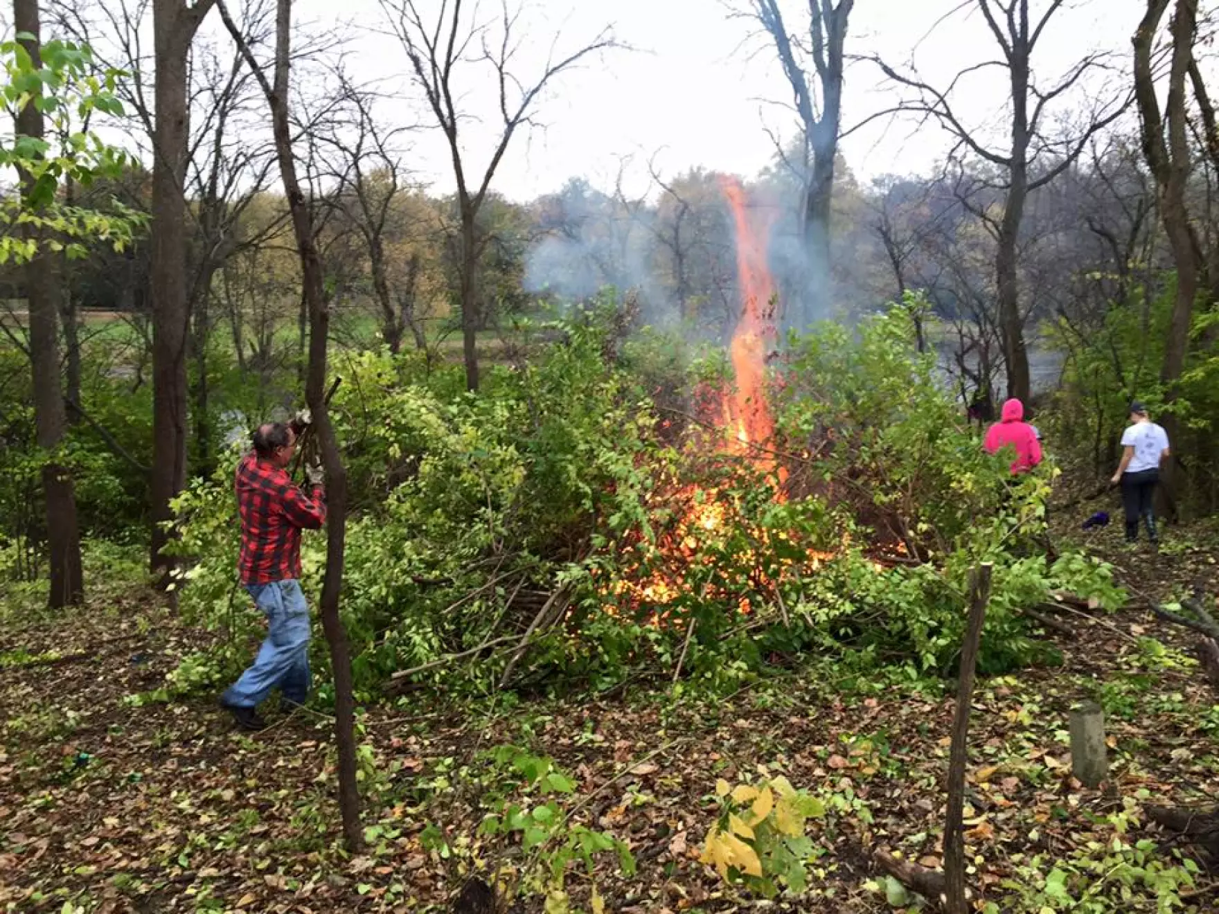 Volunteers add honeysuckle clippings to a burning brush pile in the early years of the project. (Photo Credit: Friends of Langham Island)
