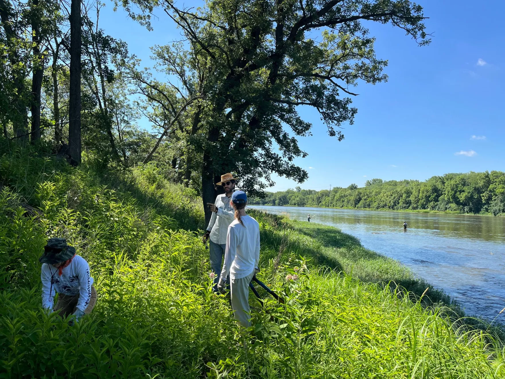 Molly Ulrich (left) and other volunteers weeding out invasive plants on the banks of Langham Island, in the middle of Kankakee River State Park. (Photo Credit: Claire Keenan-Kurgan/Points North)