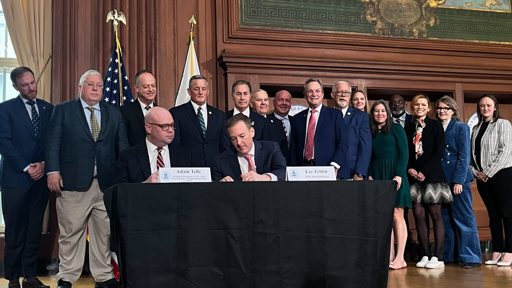 Featured image: EPA Administrator Lee Zeldin (center) signs a proposed rule in Washington, D.C. that would revise the definition of “waters of the United States,” scaling back which bodies of water are subject to federal protections. Credit: Aidan Hughes/Inside Climate News