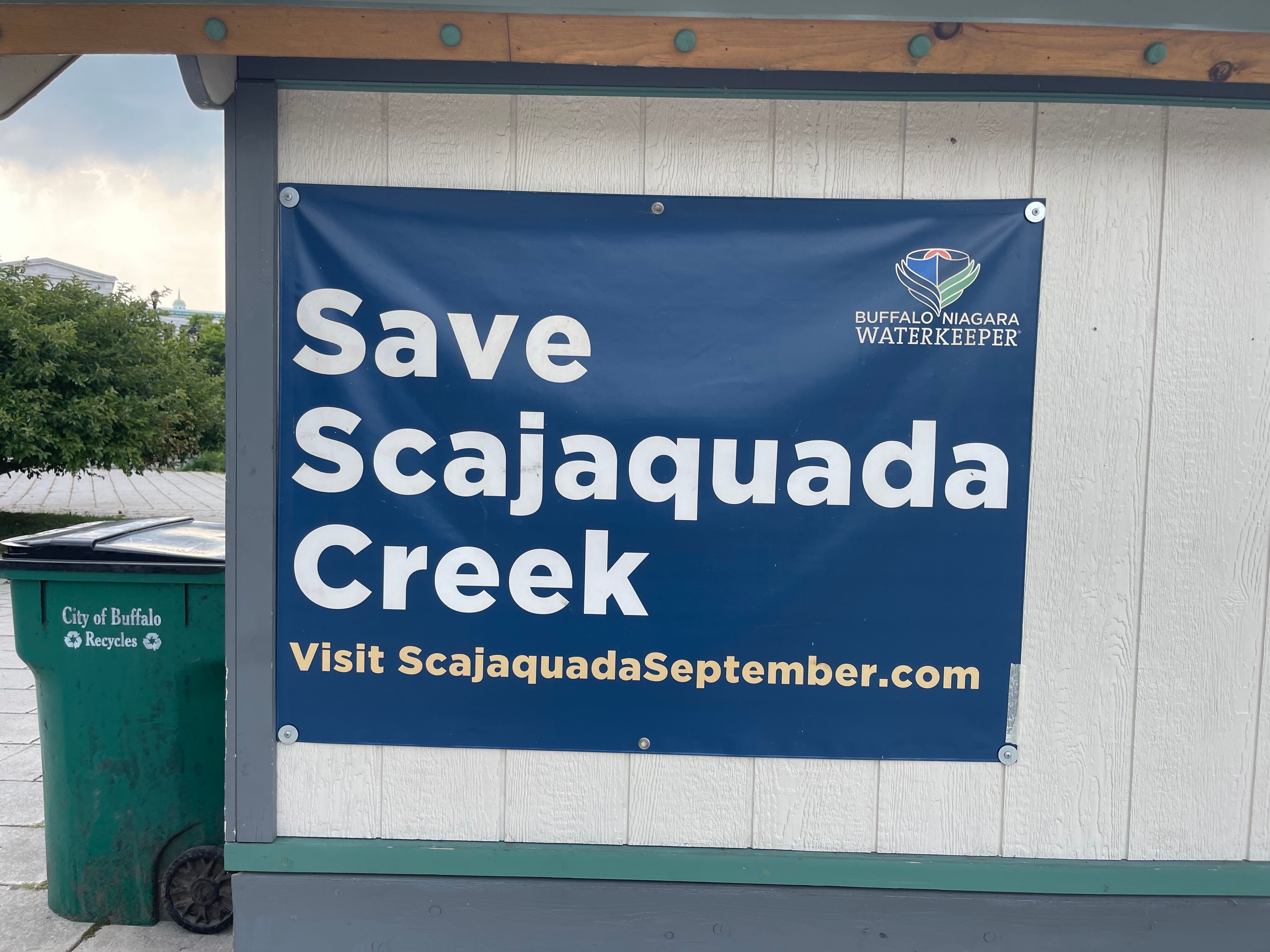 Buffalo Niagara Waterkeepers efforts to improve Scajaquada are persistent including public awareness campaigns like this banner at Hoyt Lake in Buffalo. (Photo Credit: James Proffitt)