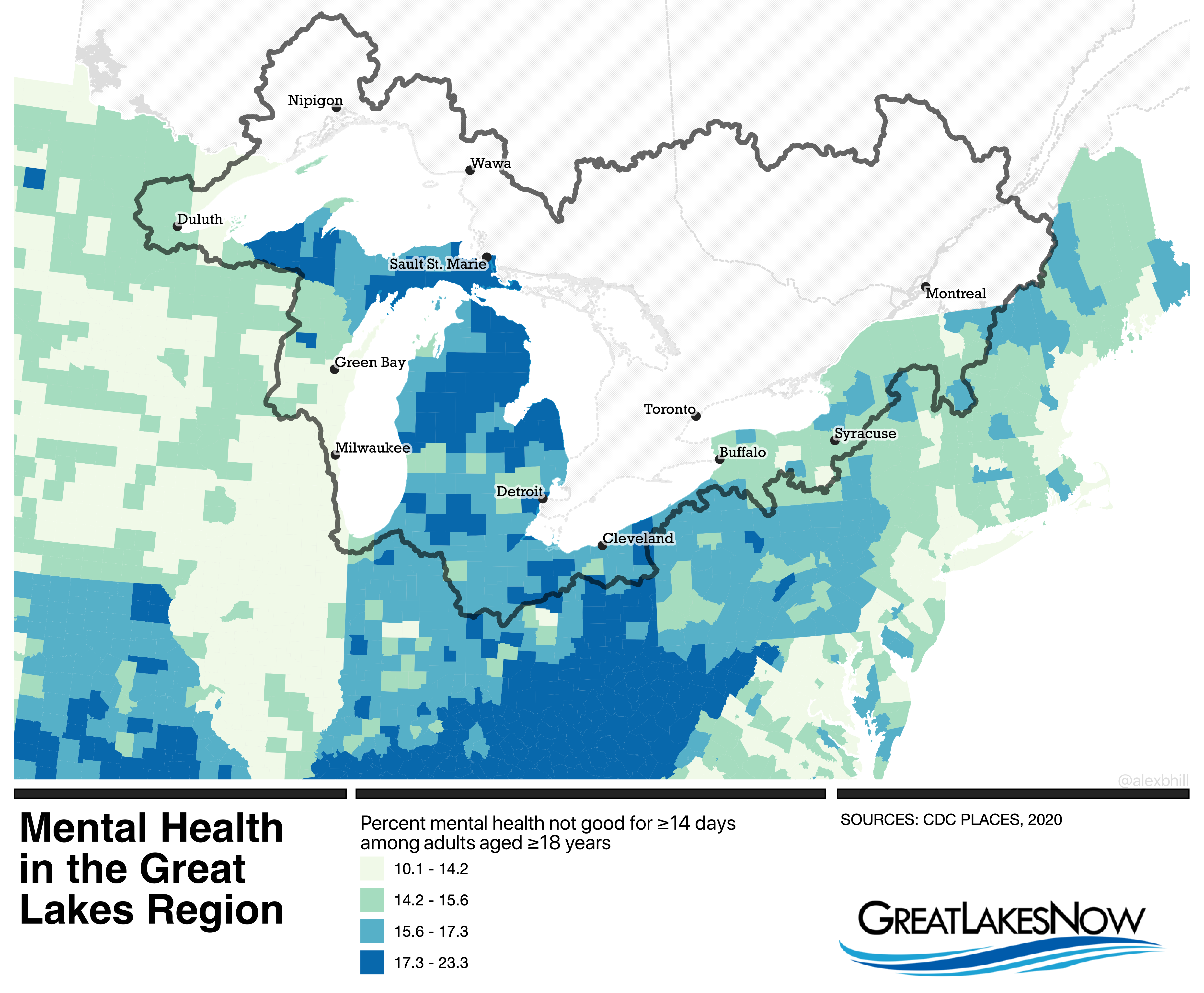 On the map, Michigan stands out as a place with more people in counties experiencing poor mental health days. Michigan ranks high for depressive events compared to the national average and faces a mental health care crisis. The Great Lakes present an opportunity to explore the relationships between wellbeing of residents, quality of life and the freshwater assets of the Great Lakes in both urban and non-urban areas. The region does has 27 Areas of Concern for environmental quality which likely complicates the benefits of blue spaces.