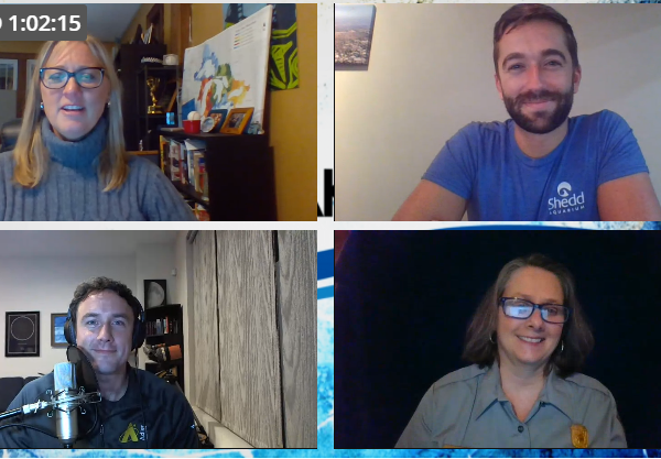 Great Lakes Now Program Director Sandra Svoboda chats with Pam Barnes from Cuyahoga Valley National Park, Austin Happel from the Shedd Aquarium and Nick Lake from the Adler Planetarium.