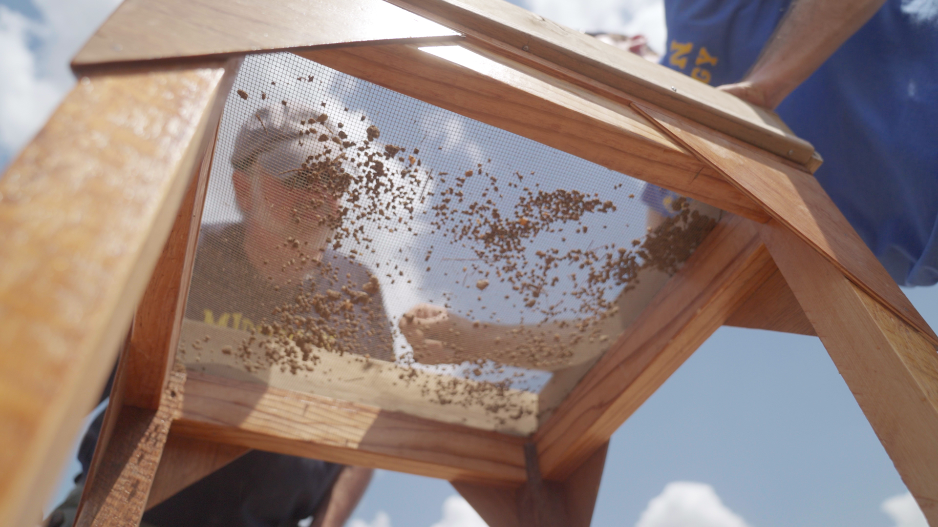 “So what we’re looking for are the tiniest little flakes,” said Nash as he sifts through a pile of dirt carefully removed from the site. Those tiny flakes are evidence that the Clovis hunters were making their spear points on this spot.